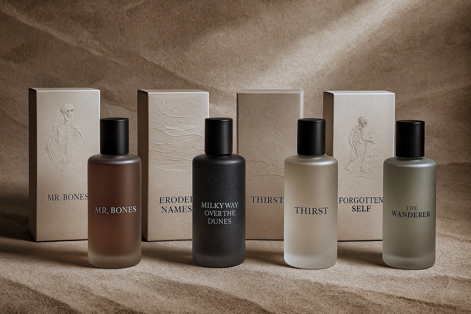 Each perfume is crafted as an echo of place: the vast stillness of the desert, the fragile shimmer of memory, the resonance of moments that refuse to fade. We work with care and intention, distilling time, atmosphere, and emotion into compositions that are both elemental and ethereal.